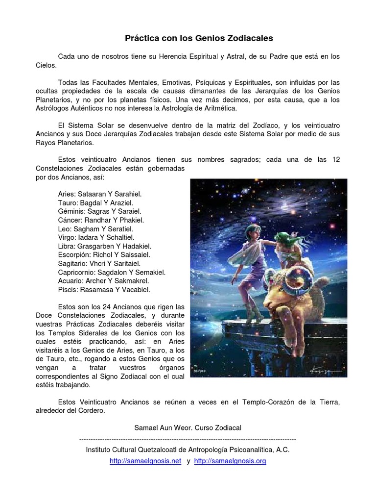 Estos son los 24 Ancianos que rigen las Doce Constelaciones Zodiacales y durante vuestras Prácticas Zodiacales deberéis visitar los Templos Siderales de los Genios con los cuales estéis practicando. Angel of Commotion-Ziiel as noted in Odeberg 3Enoch. Sagdalon y Semakiel Los nativos de Capricornio tienen disposición para la pedagogía sufren mucho tienen un gran sentido del deber son prácticos por naturaleza y pasan en su vida siempre por un gran sufrimiento alguien les traiciona.